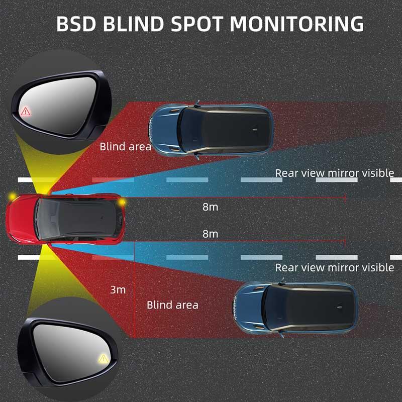 Blind Spot Detection (BSD) detects the blind area of the rearview mirror through the radar at the rear of the vehicle.It can detect the blind spot of the vehicle and help the driver avoid the risk of lane change.